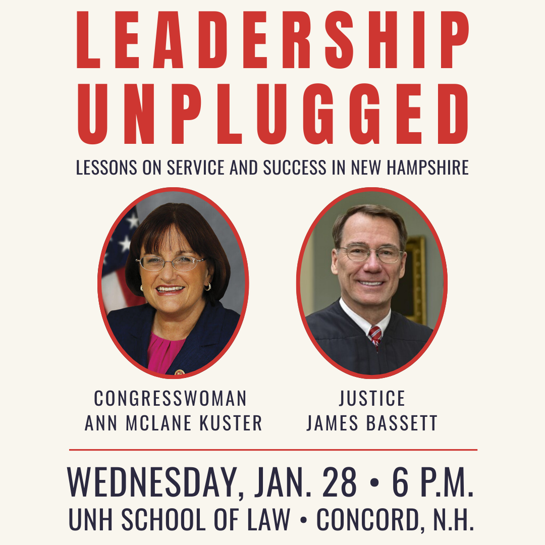 Through engaging stories and unfiltered insights, hear from two of New Hampshire’s most respected public servants as they share what decades of service have taught them about influence, connection, and making a difference in the Granite State. Hosted by Leadership New Hampshire in partnership with the Warren B. Rudman Center for Justice, Leadership & Public Service, Leadership Unplugged brings together recently retired Congresswoman Ann McLane, ’93, Kuster and recently retired New Hampshire Supreme Court Justice James Bassett, ’94, who will share their hard-earned lessons from their decades in public service. Learn more and register.